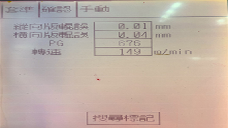 (2) 光电眼的光源是由一个卤素灯提供,众所周知,卤素灯是通过给钨丝导通足够的电流,使灯丝发热至白炽状态而发出光亮,所以卤素灯的寿命比较短,一般使用2000~2500小时后光源会产生衰减而导致光电眼的光标信号减弱,影响套色效果,此时就应该更换新卤素灯。 (3) 印刷时,在油墨未干的情况下,有些油墨会粘着在光纤电眼的透镜表面,导致光量不足。所以开机前一定要检查电眼透镜表面是否干净,如有污物粘着,可使用纯棉布或棉花沾浓度90%以上的酒精进行擦拭,直至光眼透镜表面透亮。 (4)如果波形较小的色组印刷浅色,则可以通过调节中继箱内信号放大器电路板上的增益旋钮,使用电笔将旋钮向右缓慢旋转直至显示器上波形放大至正常工作波形即可,不过这种方法调整的幅度有限。 问题二:套色波形无显示,直接为一条直线 故障原因: (1)脉冲发生器异常;(2)色组间通讯异常。 处理方法: (1)编码器对印刷版辊的实时位置进行跟踪,如果系统检测不到编码器信号,那波形自然无法显示,检测方法为:停机并将无波形色组打至“单动”模式,然后点动设备并查看套印人机界面,人机界面调整至确认页面(如图4),如PG这一栏显示的数值无变化,即可判断该色组印刷版辊编码器损坏,此时只须更换该编码器即可排除故障。